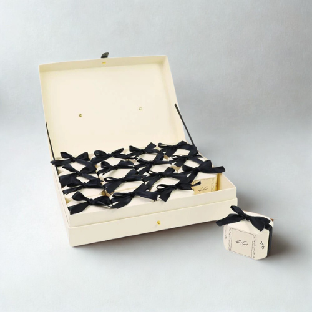 بوكس توزيعات فاخر يحتوي على 16 علبة فاخرةتحتوي على مسك ابيض فاخر وكسرة عودمتوفر باللونين السكري والبيج